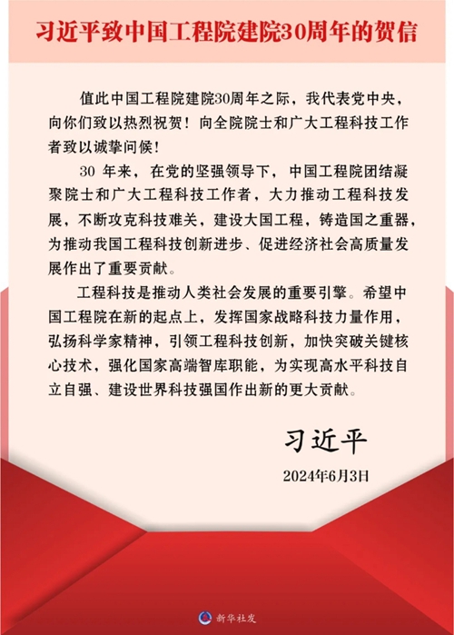 習近平在賀信中指出,30年來,在黨的堅強領導下,中國工程院團結凝聚院士和廣大工程科技工作者,大力推動工程科技發展,不斷攻克科技難關,建設大國工程,鑄造國之重器,為推動我國工程科技創新進步、促進經濟社會高質量發展作出了重要貢獻。
