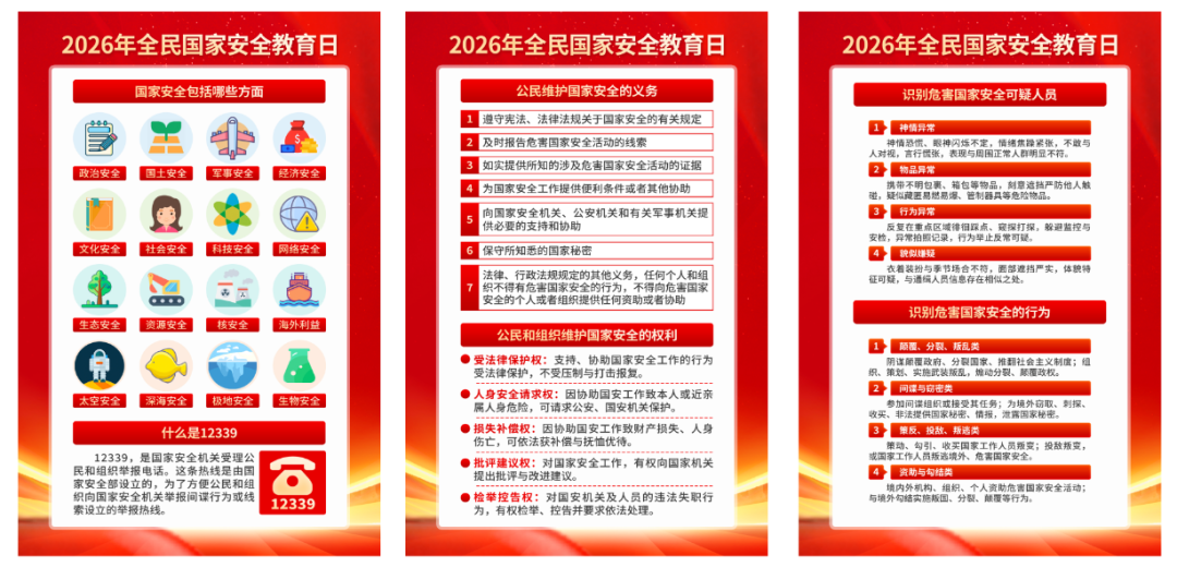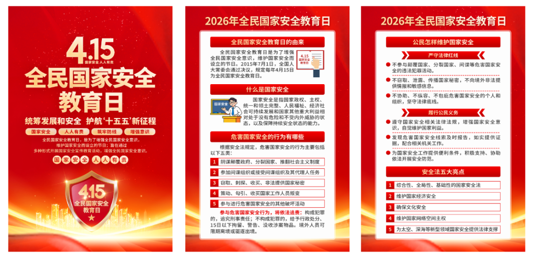 2015年7月1日,第十二屆全國人民代表大會常務委員會第十五次會議通過《中華人民共和國國家安全法》,該法自公布之日起施行。其中第十四條規定,每年4月15日為全民國家安全教育日。 2026年是國家安全法頒布施行11周年,4月15日將迎來第十一個國家安全教育日,主題是“統籌發展和安全,護航‘十五五’新征程”。旨在深入貫徹落實總體國家安全觀,進一步增強全民國家安全意識,推動國家安全事業不斷向前發展。下面我們一起學習相關知識吧! 什么是國家安全? 2015年7月1日施行的《中華人民共和國國家安全法》明確指出:國家安全是指國家政權、主權、統一和領土完整、人民福祉、經濟社會可持續發展和國家其他重大利益相對處于沒有危險和不受內外威脅的狀態,以及保障持續安全狀態的能力。